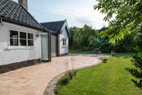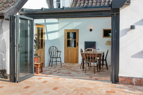 The two arms of this venerable house are bridged to make a garden room. When the folding glass panels are opened out the garden room blends into the patio and thence to the garden.